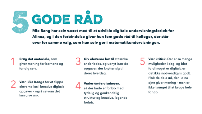 Som forfatter til matematikbøger og udvikler af digitale undervisningsforløb for forlaget Alinea har Mie Bang, lærer på Antvorskov Skole ved Slagelse, et ben i hver lejr. Hun mener, at bøger og digitale undervisningsforløb har hver deres styrke og tilsammen gør undervisningen bedre.